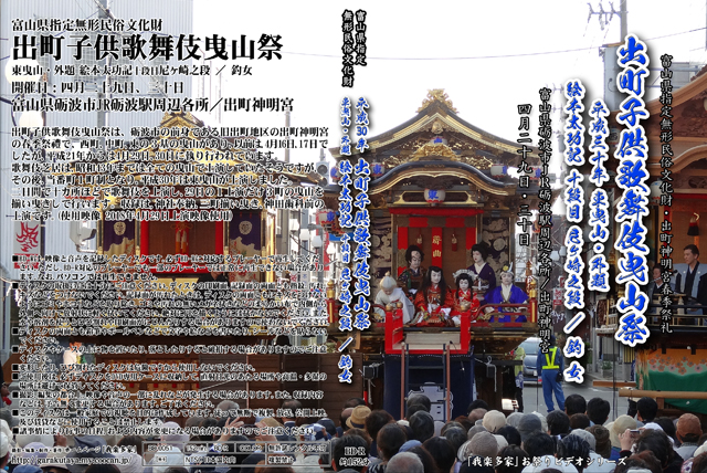 平成31年度の出番山は、常磐山、孔雀山、翁山、萬歳樓です(収録順)。このビデオには、常磐山「一條大蔵譚」、孔雀山「勧進帳」、翁山「碁太平記白石噺 新吉原揚屋の場」、萬歳樓「鳥辺山心中」の子供狂言(歌舞伎)を収録しています。「勧進帳」は孔雀山の横から撮影しています。