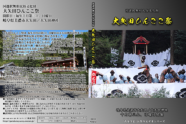 岐阜県美濃市大矢田で毎年10月第三日曜日に行われる大矢田神社秋季大祭で「大矢田ひんここ祭」が行われます。 数年前までは毎年4月中旬に行われていましたが、令和5年から10月になりました。 お旅所横の山の中腹に舞台が作られ、朝から祢宜人形が舞い続けます。 午後にお旅所で神事が行われ、お旅所前の2台の山車の上で稚児の舞と獅子の舞が行われます。 舞が終わるとひんここの舞が始まります。 ひんここの舞は、11体の農人形が大蛇に食べられ、祢宜(須佐之男命)が大蛇を退治するという麦蒔予祝の人形芝居です。 なお、ひんここの舞は一部省略した形で11月第4日曜日に行われる紅葉祭りでも披露されます。 収録時間は、BD-R版が約68分です(2024年(一部2013年)撮影映像使用)。 なお、収録映像は、16:9のワイドサイズです。