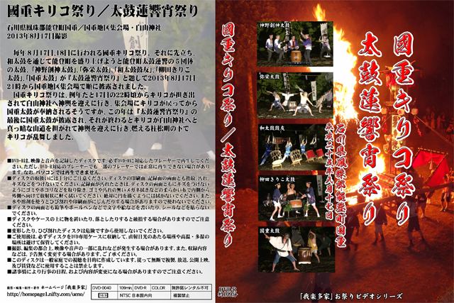 石川県鳳珠郡能登町国重で8月17日、18日に行われる国重キリコ祭りの2013年の宵祭りで行われたキリコ運行とその前に行われた太鼓蓮響宵祭りの様子を収録したものです。
