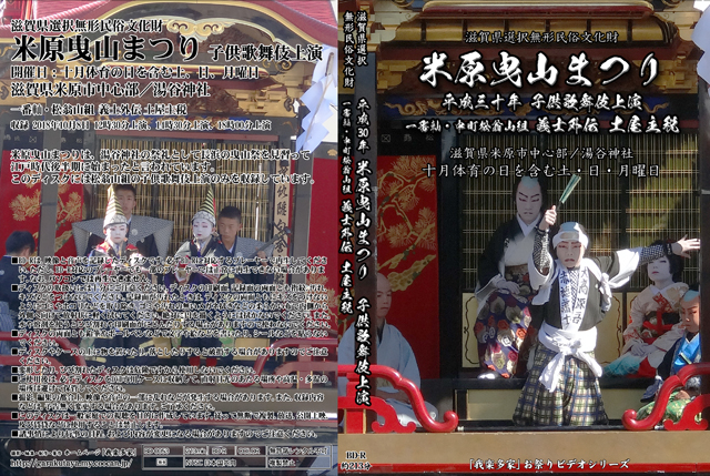 平成30年度の出番山は、猩々山、壽山、高砂山、鳳凰山です(収録順)。このビデオには、猩々丸「一谷嫩軍紀 熊谷陣屋の場」、壽山「山内一豊とその妻千代 似合夫婦出世絏 長浜 一豊の屋敷」、高砂山「義士外伝 土屋主税」、鳳凰山「恋飛脚大和往来 梅川忠兵衛 新口村の場」の子供狂言(歌舞伎)を収録しています。