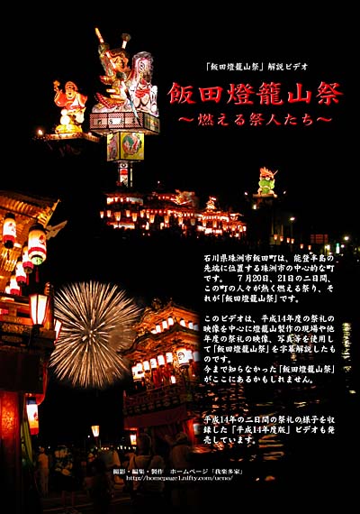 石川県珠洲市飯田町で7月20日、21日に行われる「飯田燈籠山祭」を平成14年度の祭礼の映像を中心に燈籠山製作の現場や他年度の祭礼の映像、写真などを使用して祭りを字幕解説したものです。